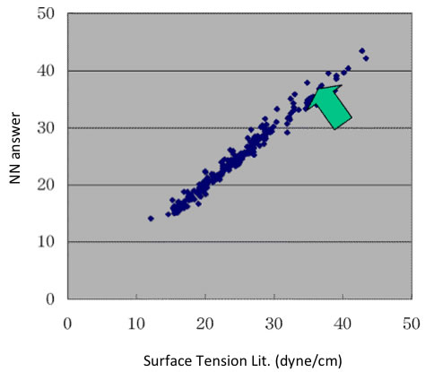 Then how can we know which data is more reliable? For propylene glycol case, If I reduce middle layer neuron number 3 to 2, the estimation result become 40dyn/cm like chart below, so 35.5dyn/cm seems to much reliable. But it is very rare case finding these unreliable data.