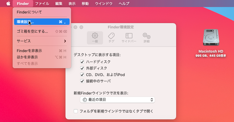 そして、一般設定の中の"ディスクトップに表示する項目"でハードディスクにチェックを入れるとMacintosh HDが表示されるようになります。