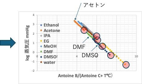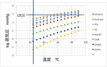 蒸気圧が1mmHgになる温度はアントワンのパラメータが求まっていれば直ぐに決定できる。1mmHgの蒸気圧を与える分子の運動エネルギーを与える温度だ。