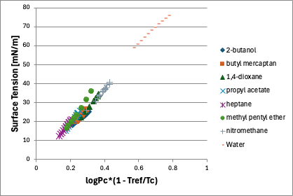 これと同じで、水の表面張力が高いのは、室温が水の臨界点から遠いためで、フロンが表面張力が低いのは室温が臨界点に近いからだ。