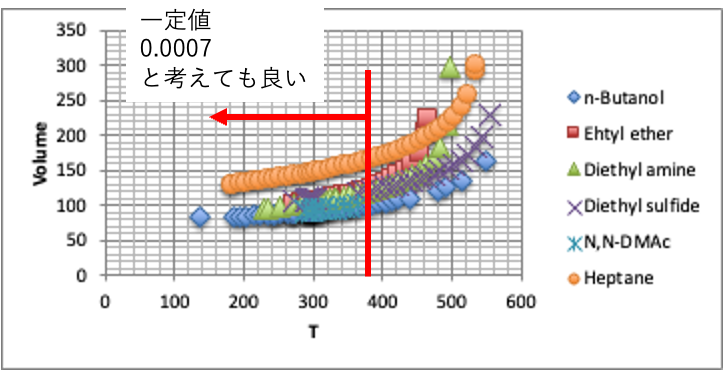 すると、任意の温度での分子体積は簡単に推算する事が可能になる。