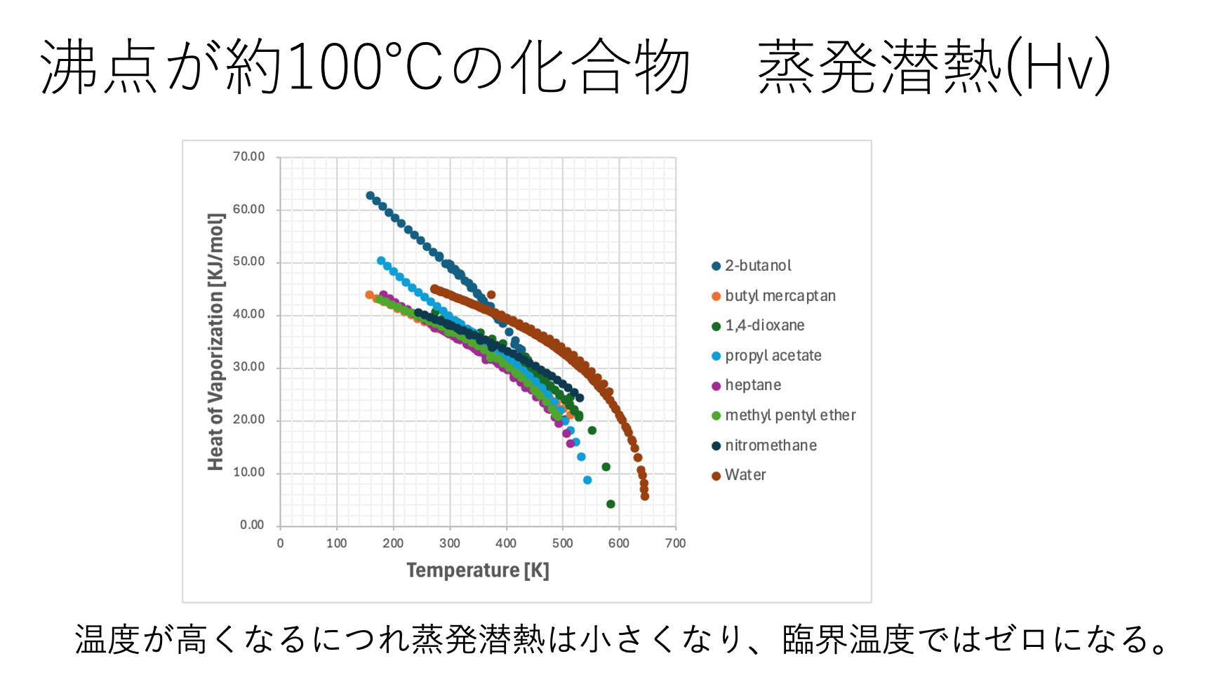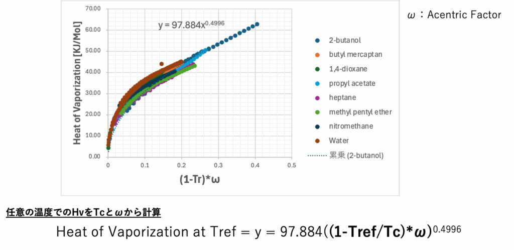 偏心因子を使えば、アルコールや水も含めて蒸発潜熱を任意の温度で推算する事ができる。この時の横軸で25℃は化合物によって皆異なる。