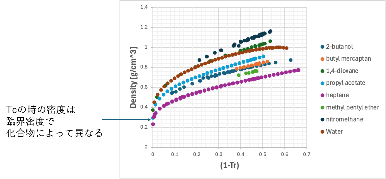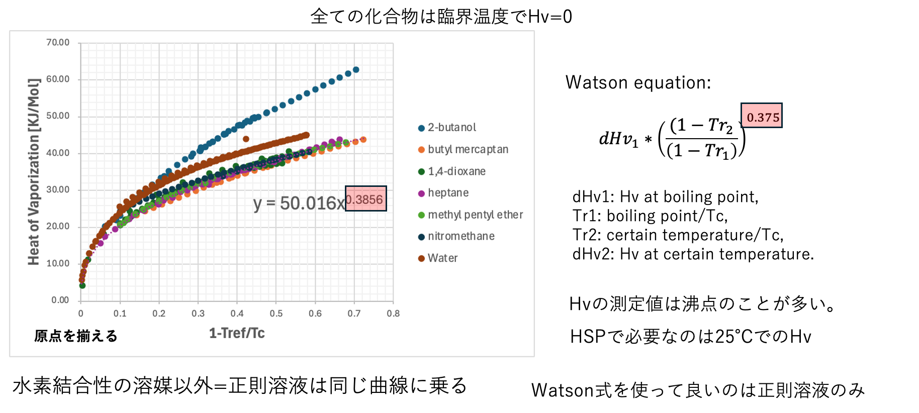 化学工学では当たり前の使い方だけれど、どの化合物も臨界点では蒸発潜熱がゼロになるなら、温度軸を、1-Tref/Tcにかえれば、臨界温度の時の蒸発潜熱はゼロなので原点が共通のゼロになる。