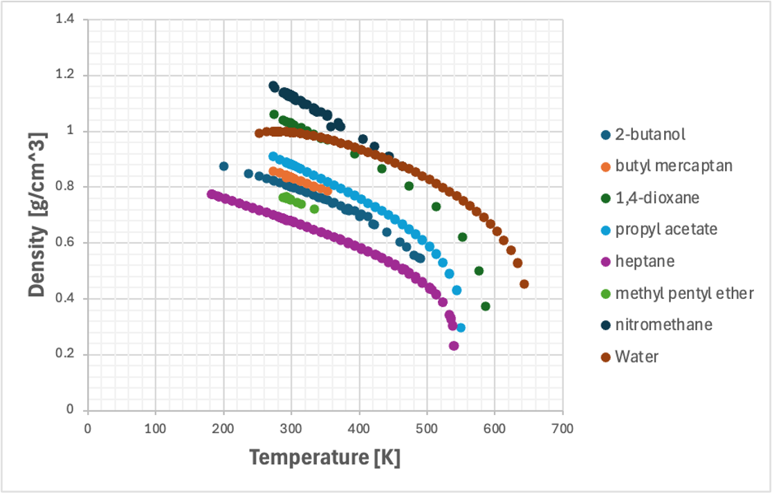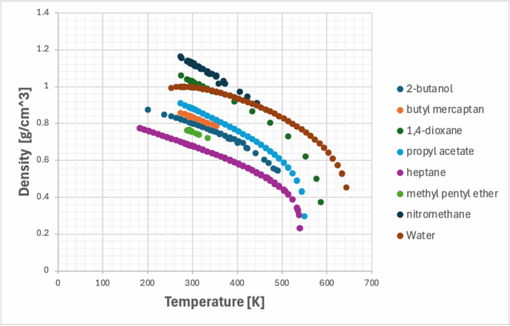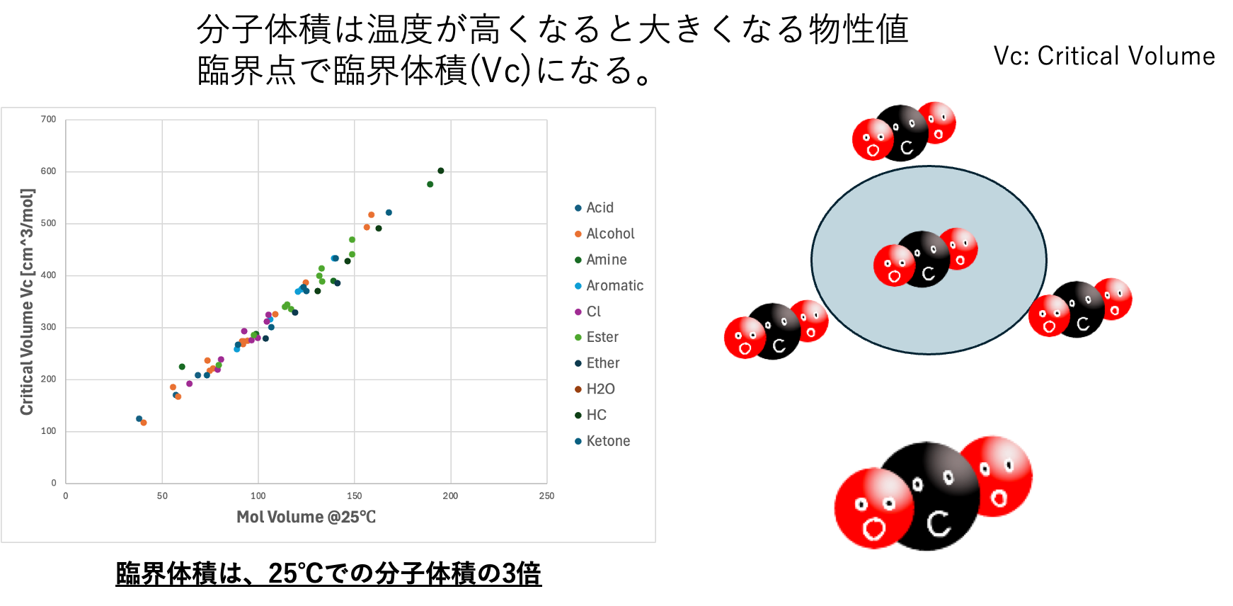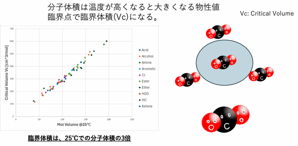 化合物の25℃での分子体積と臨界体積(Vc)をプロットしてみると非常に綺麗な相関がある。pirika.comでは常識として扱ってきたが、知らない研究者も多いかもしれない。