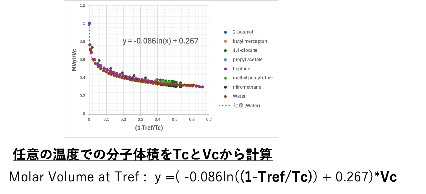 以上のように、任意の温度での蒸発潜熱と分子体積が臨界点とωから推算する事ができる。そして臨界点とωはY-MBを使えば推算できる。