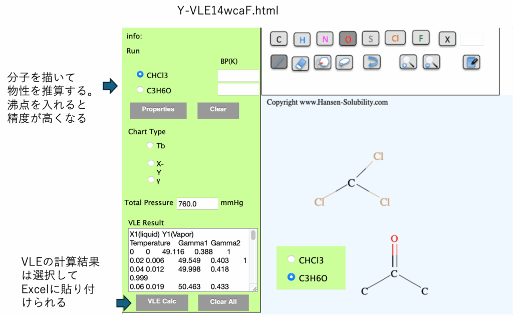 とりあえず、私(pirika.com社CEO)の作成したY-VLEを使って気液平衡の推算値を得る。これを使ってASOGの未決定のパラメータを決めていく。