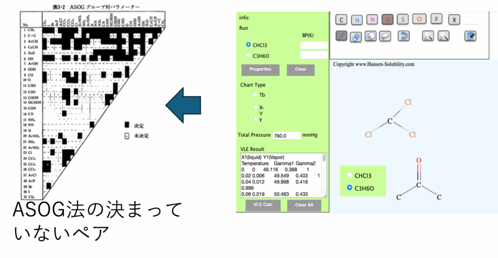 ASOG法やUNIFAC法では 気液平衡を推算するのに、原子団ごとのパラメータが必要になる。60個の原子団があると60*59の原子団ペアが存在する。そのペアごとに4つのパラメータを決めなくてはならない。パラメータがないとその分子は計算できない。