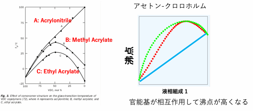私はこの現象は、アセトン-クロロホルムが最高共沸を起こすのと同じだと思っている。Tgの上昇と溶解性の関係を調べる。につながれば良いと思っていたが。