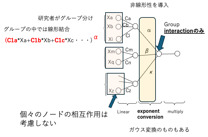 そしてグループの中では線形結合で表現し、それをまとめて指数関数やガウス関数で非線形変換をかける。非線形性はグループ間だけ考える。
