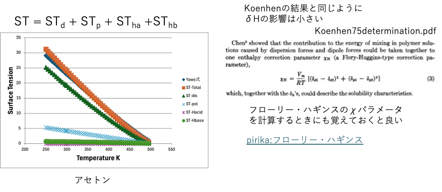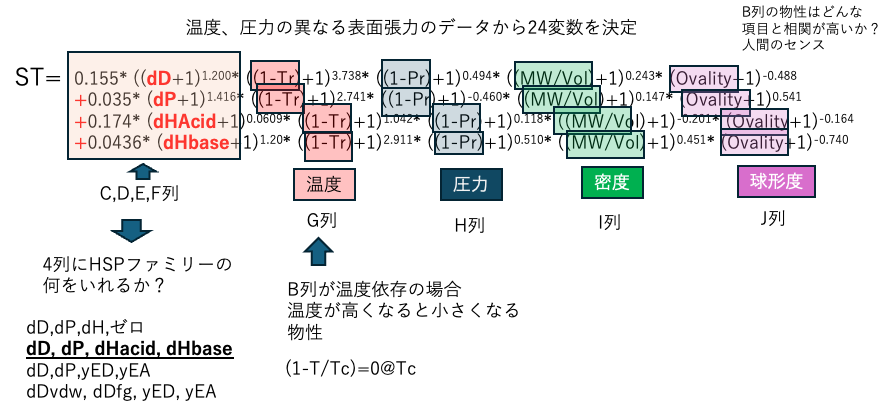 ある温度、圧力の時の表面張力はこのような式で表すことができる。HSPの4列にHSPファミリーのどのような値を入れるかは研究者の好みである。
