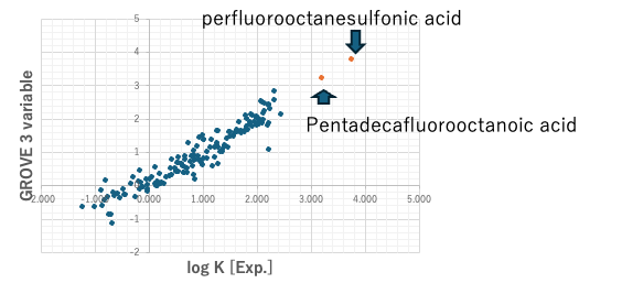 その結果を用いるとPFAS類は他の有機化合物に比べるととても強く活性炭に吸着すると予測される。