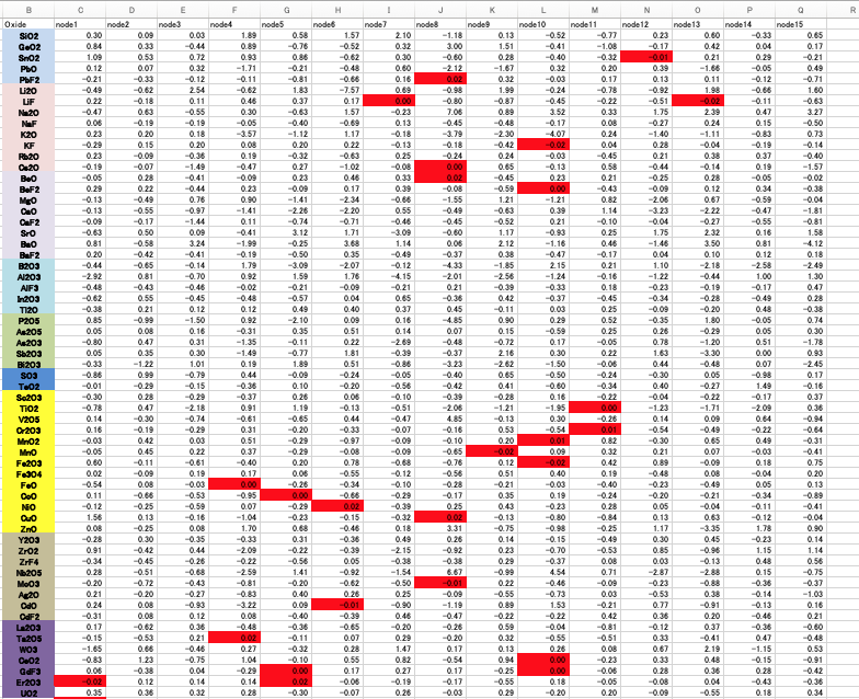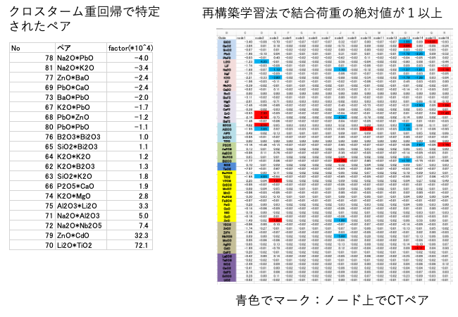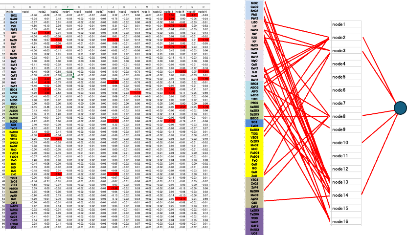 例えばLi2OとTiO2は大きなクロスターム係数をもつ。結合荷重でのnode2のLi2OとTiO2は大きな結合荷重を持つ。node2ではAl2O3も大きな結合荷重を持つ。Li2OとAl2O3は大きなクロスターム係数を持つ。