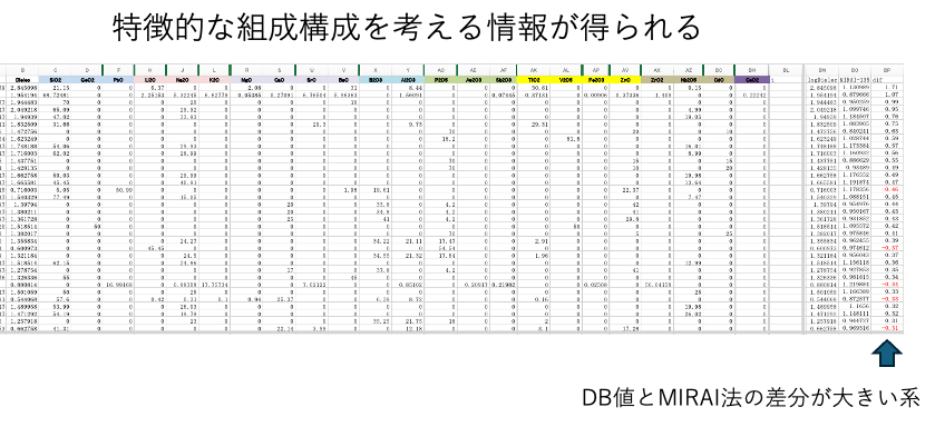 MIRAI法の結果を示す図4[c]で、縦軸(MIRAI法計算値)が同じなのに、横軸(誘電率のDB値)が大きく異なるデータを抽出する事ができる。