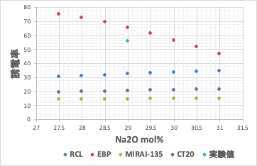 実験値は[b]誤差逆伝播NN法で計算したものに一番近い。ところがNa2Oを29mol%から増減すると[b]では計算値が46.7-75.1と大きく変化してしまう。シンプルなEBP-NN法で推算式を構築すると過学習を起こしている事が確認される。