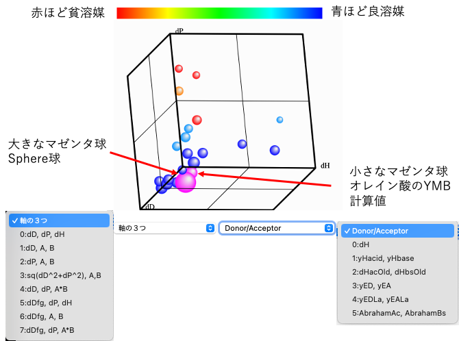 溶媒は青色ほど良溶媒、赤いほど貧溶媒に設定される。オレイン酸はYMBで計算された値で小さなマゼンタ球として表示される。通常の3次元HSPで計算されたSphereの中心に大きなマゼンタ球が表示される。マウスで溶媒をクリックすると溶媒名が表示される。マウスでドラッグすると回転、Shift-Dragで拡大縮小、Option-Dragで移動する。