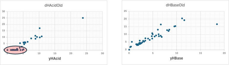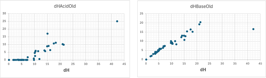 もとのdHとdHAcidOldをプロットすると、上図左になる。両性のアルコール、アミン、カルボン酸以外はAbrahamのAcidを持たないので、dHAcidOldはゼロになる。dHが7以下ではdHAcidOldはゼロになる。従って、dHが7以下ではdHBaseOld=dHとなる。