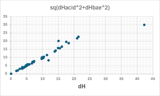 dHAcidがゼロのものの溶解度がゼロなら問題ない。極性が高いポリマーはdHが小さな溶媒に溶けにくい。そんな時には問題は大きくない。dHAcidがゼロの溶媒によく溶ける場合には問題になる。ポリマーのdHAcidPがほぼゼロにアサインされてしまう。