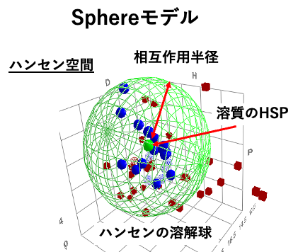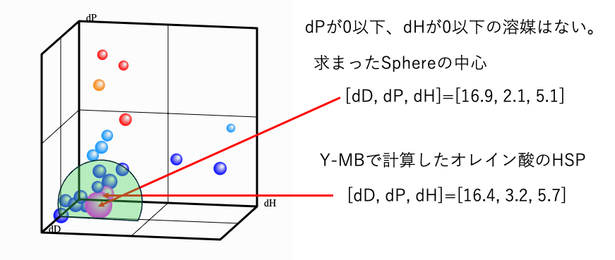 溶媒のyHacidが値を持ち、その分Sphereが底面から浮いてくる。そしてYMBで計算したHSPとSphere法で求めたHSPはほぼ一致する。