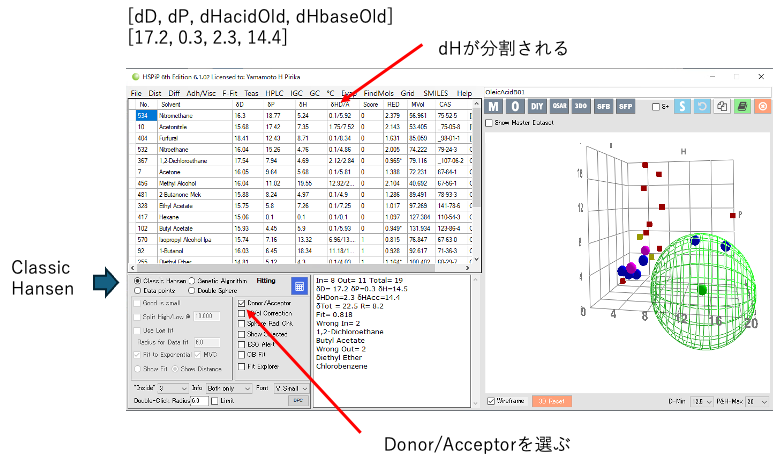 Classic Hansenを選択すれば、Donor/Acceptorを選ぶことができる。選択するとdHのカラムが分割される。その後で計算ボタンをクリックすると、[dD, dP, dHdo, dHac]のSphereが計算される。4次元を3次元に表示するので画面は意味を持たない。