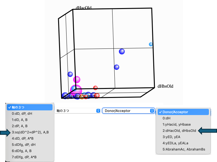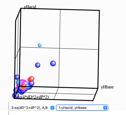 先に説明したように、ほとんどの化合物でdHacidOldはゼロになる。そこでこの表現では多くの溶媒は底面に配置されてしまう。アルコール以外の良溶媒は皆底面にあるので、挟み撃ちするとSphereの中心も底面に配置されてしまう。