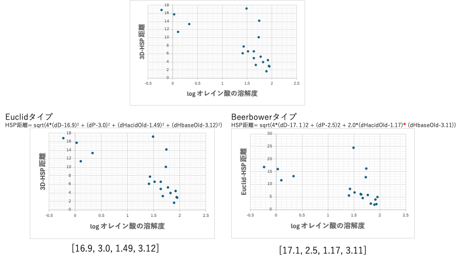 幸いにもこの場合はYMBで計算したオレイン酸のHSPとSphere法で計算したHSPがほぼ一致したので信頼性は高いようにも思える。