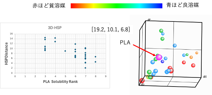 このクラッシクの3D-HSPできがよい。青系統(良溶媒)がPLAの溶解球(マゼンタ)そそばにあり、離れるに連れ赤系統(貧溶媒)になっていく。PLAのHSPは[19.2, 10.1, 6.8](マゼンタの中心)と求まる。