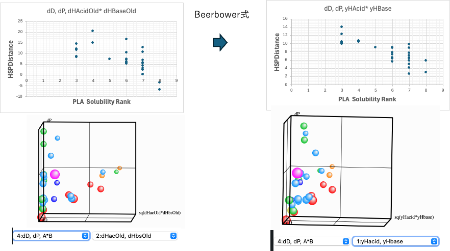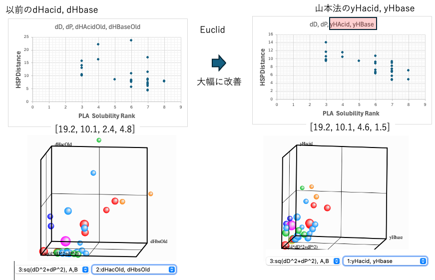 それに対して新開発のyHacid, yHbaseを使うと溶解ランクとHSP距離の相関はとても改善される。PLAのdHacidは4.5と底面から浮き上がってくる。