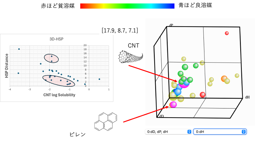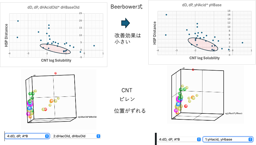 もともとカーボンファミリーのdHは大きくない。それをどう分割してもHSP距離と分散性には大きな相関はない。ところがdHやdHacid/dHbaseを使ったHSP距離と関係なく分散性が変わる現象が厳然としてある。