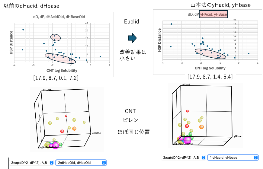 3軸は、dD, dP, A*Bを選び、A, B分割としてdHacidOld, dHbaseOldを選ぶ。dHacidOldがほとんどの溶媒でゼロになるので、dHacidOld*dHbaseOldもゼロになってしまう。そこで溶媒は左の側面に張り付いてしまう。Beerbower距離で考えても山本の分割法は有効である。