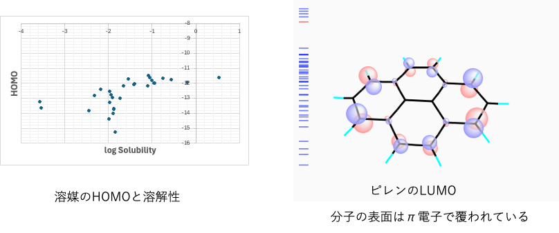 ピレンのHOMOやLUMOはπ電子で覆われている事がわかる。