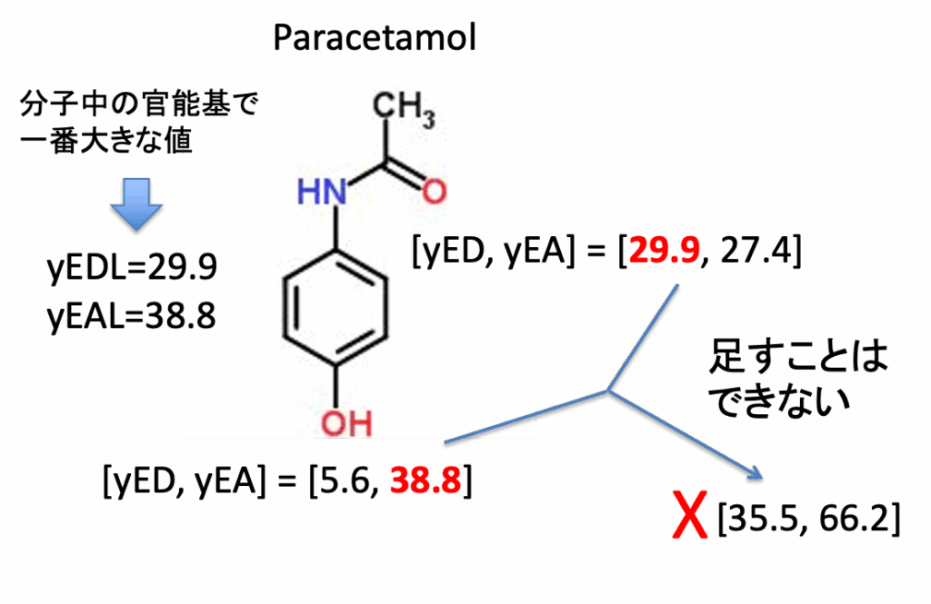 HSP50周年記念講演会で話した。分子中に複数の官能基がある場合、その官能基に割り振ったyED, yEAはHSPのように足して分子全体のパラメータとして評価するのは無理がある。他の化合物のEDと相互作用するなら、分子中で一番大きいフェノールのyEALと相互作用するのだろう。