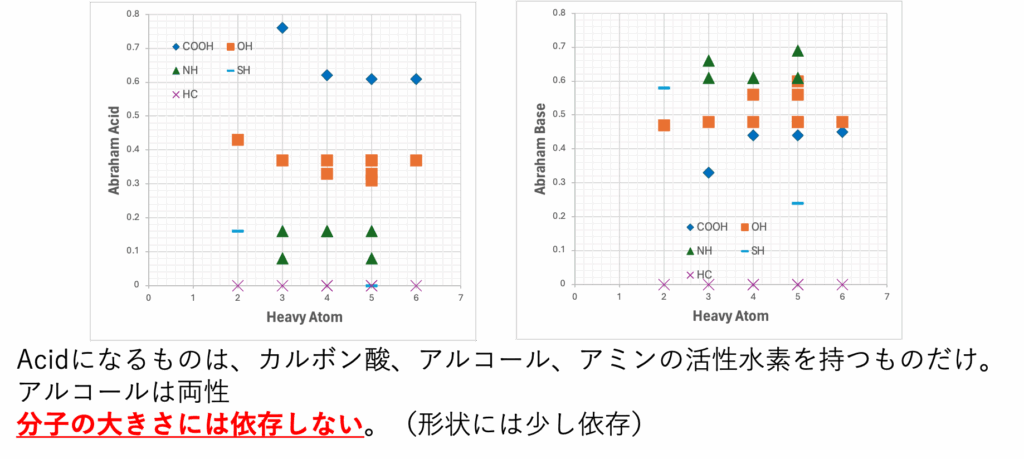 AbrahamのAcid/Baseもカルボン酸ならカルボン酸で、分子の大きさには寄らない値となる。(蟻酸とか一番小さいものだけ例外)